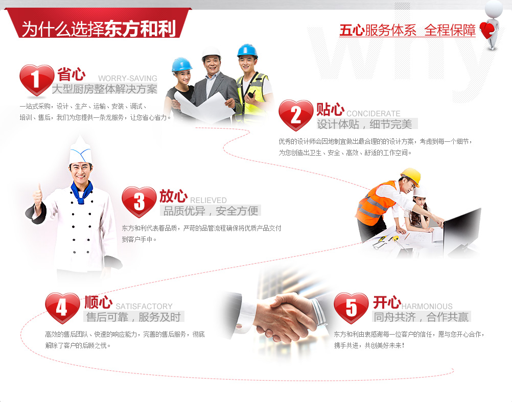 廚房工程建設(shè)是一項龐大復(fù)雜的系統(tǒng)工程,既需要與后勤工作人員、廚師溝通協(xié)調(diào), 又要與土建、裝修、機(jī)電、暖通等工程人員相互配合,工作量十分巨大。同時還要采購眾多的食品機(jī)械、工具,這對沒有相關(guān)經(jīng)驗的我們來說確實是一個挑戰(zhàn)。有時候我們面對廚師提出的長長的采購需求清單就已經(jīng)眼花繚亂了。 幸好東方和利提供的是整體解決方案,從前期的設(shè)計咨詢到后期的安裝調(diào)試、從大型設(shè)備到餐具小件,包括各種食品機(jī)械,排煙通風(fēng),這些瑣碎事情都由東方和利來完成,為我們提供量身定制的解決方案。一站式采購為我們節(jié)省了大量精力,而且所有廚具都由東方和利來保修,對我們來說也更加方便。總之,東方和利的服務(wù)讓我們非常省心,我很滿意。